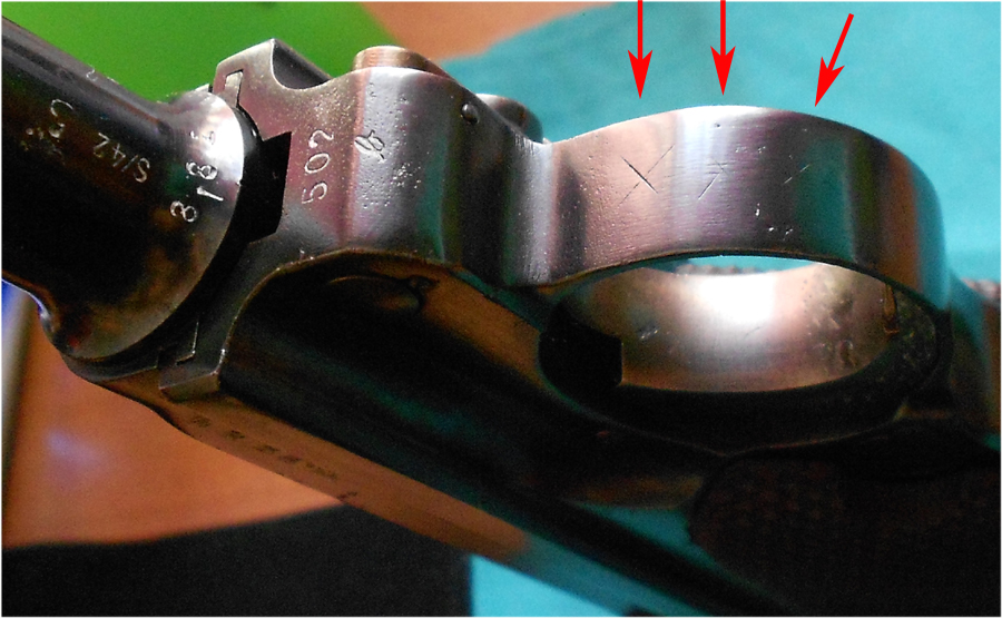 Si seguimos mirando marcas, podemos ver unas aspas en el frente del guardamontes, como cuando se borraban marcajes unitarios de policía, al cambiar la pistola de unidad. Se ven al menos 3 aspas. Y han debido quitar mucho metal, pues el guardamontes se ve bastante fino. En la foto de la subasta el guardamontes ya se ve delgadito.