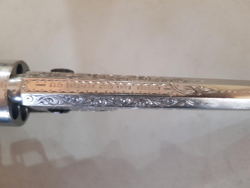 El modelo sin duda pertenece a un Colt 1851, sin embargo no es un modelo original, la primera pista la da su impoluto aspecto, carente de cualquier patina por el tiempo, tambien resulta chocante que su empuñadura y guardamonte no sean de latón, pero sobre todo lo descarta la inscripción del cañón.