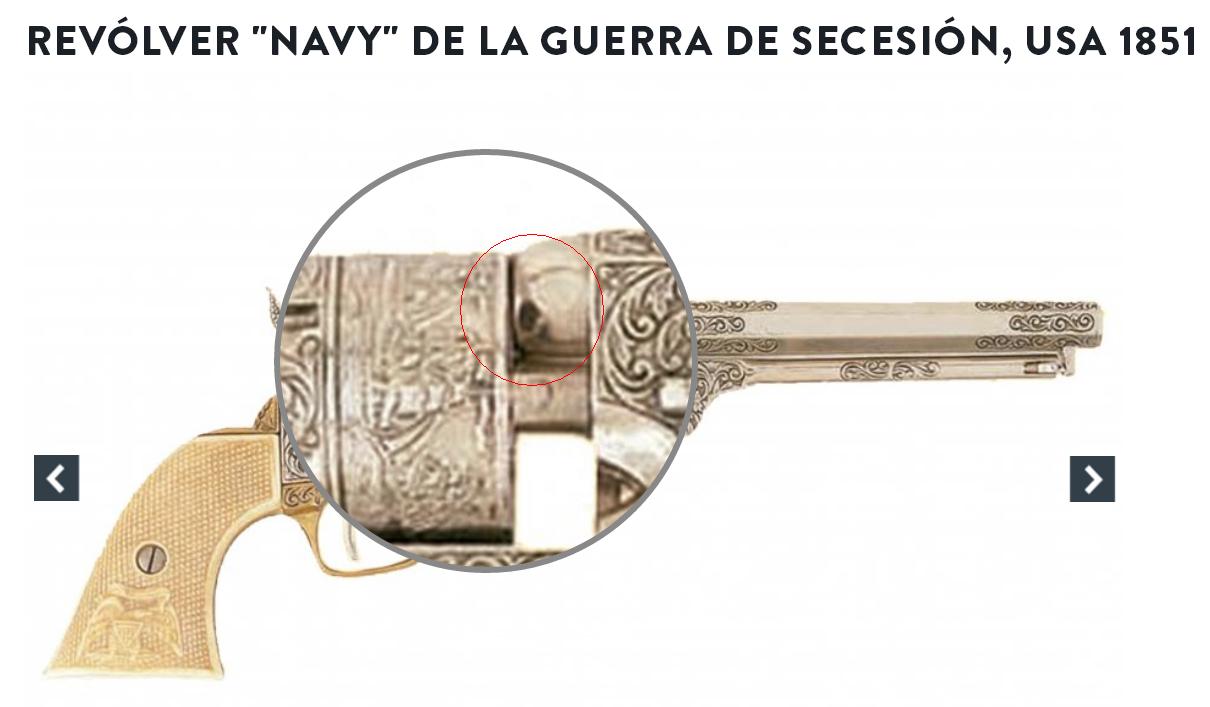 Otros detalles, veo que en el tambor esta grabada la fecha de la batalla de Campeche, que es la fecha de la batalla naval que suelen llevar los colt 1851 norteamericanos, sin embargo no veo grabado en ese tambor el numero de patente, el cual debería ir grabado en horizontal. Del mismo modo, la grabación del cañón no es correcta, en ella debería poner: Address Col. Saml Colt New-York US America.
