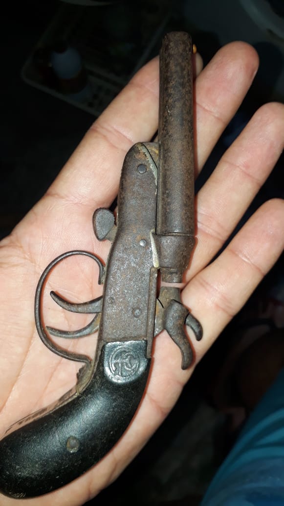 Es una pistola de dos cañones de fuego central y anima lisa. Por su estado diria que eibarresa, aunque tambien se fabricaban en francia y sobre todo Belgica. Disparaban los cartuchos de 9 mm y las mas grandes incluso el 12 mm. Tambien he visto que las habia del .22 (cartuchitos) pero no se si en fuego central o anular.