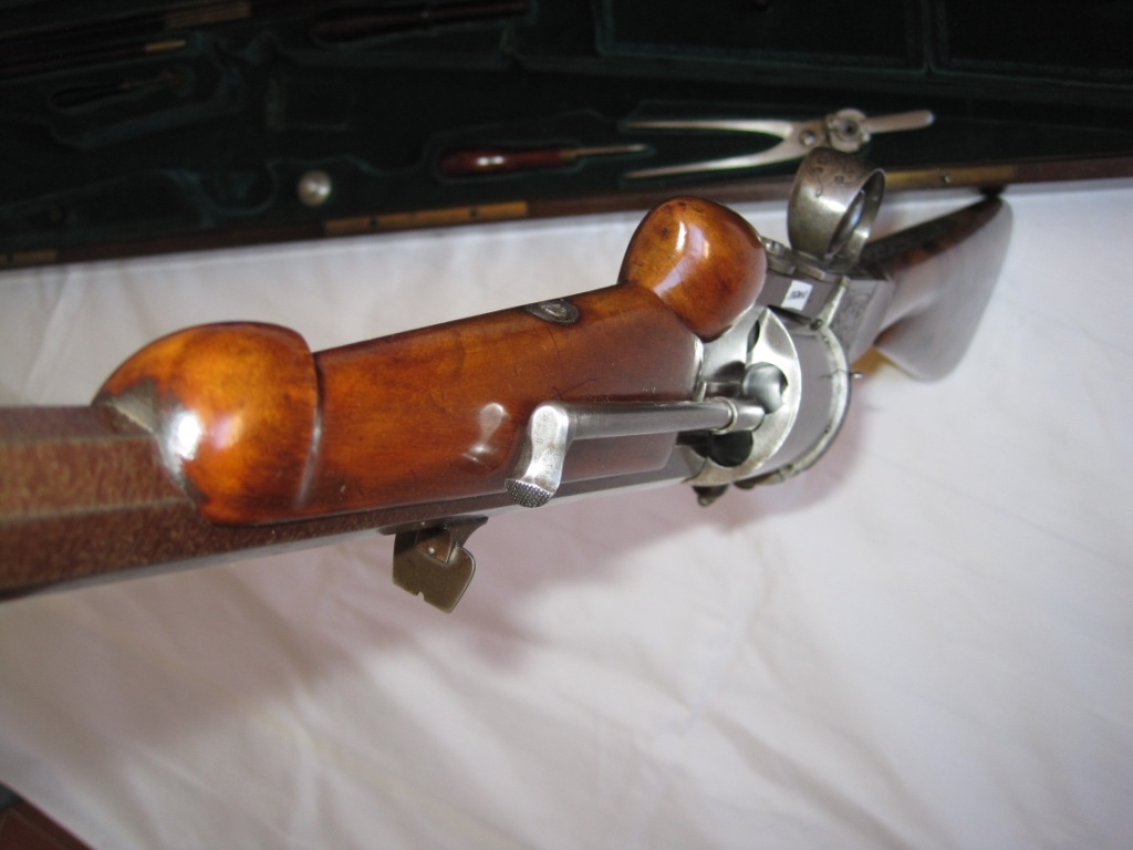Arma de fabricada en Paris entre 1860 y 1867, carabina con estuche con todos sus accesorios para regalo o hecha por encargo, todo en perfecto estado, no he vivido tantos años pero aun así, aseguraría de que no se ha disparado por el perfecto estado, tanto del arma como del los accesorios……. cañon de 14 mm de diametro.