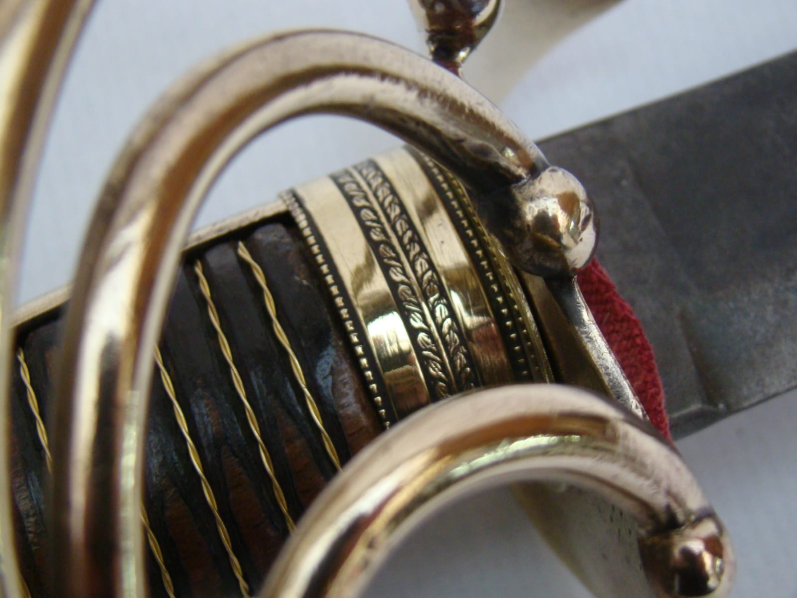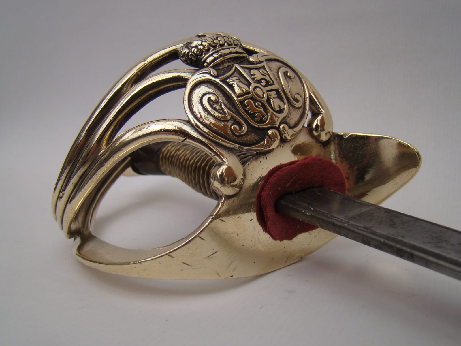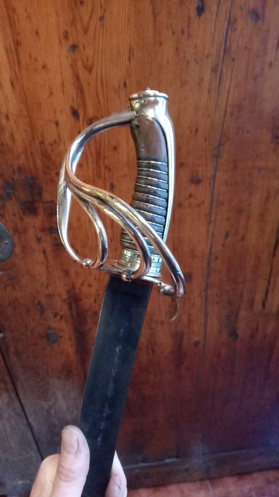-Sin embargo, sí que me parece que se han pasado un poco puliendo el latón de la guarnición, lo que no es coherente con el estado de la hoja. Yo te recomendaría que cuando la recibas no le apliques ceras ni nada parecido en la guarnición (pregunta si le han dado alguna laca, para quitarla) y déjala que envejezca al aire, pasando un trapo seco y suave cuando tenga polvo, únicamente. En pocos años tendrá un color más adecuado a una espada antigua.