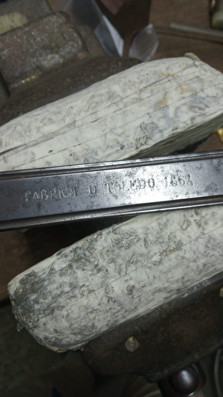 -Quizá lo mejor es que hayan tomado fotos de la espiga, consérvalas. Es sabido que en la Fábrica de Toledo es ahí donde se ponían los cuños de prueba o aceptación, lo que hace imposible verlos en general. Ojo, que a nadie se le ocurra desmontar una hoja sólo para ver la espiga, es operación con riesgo de romper algo y que siempre, siempre se nota después. Sólo está justificado al restaurar piezas en tan mal estado como estaba ésta.