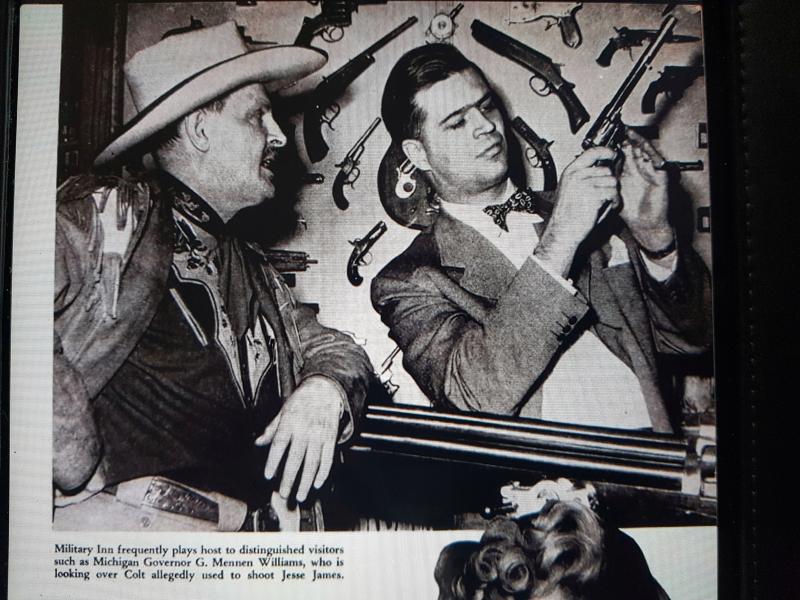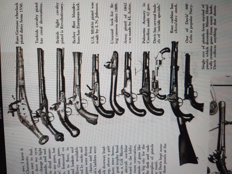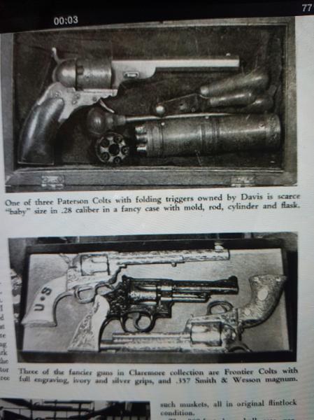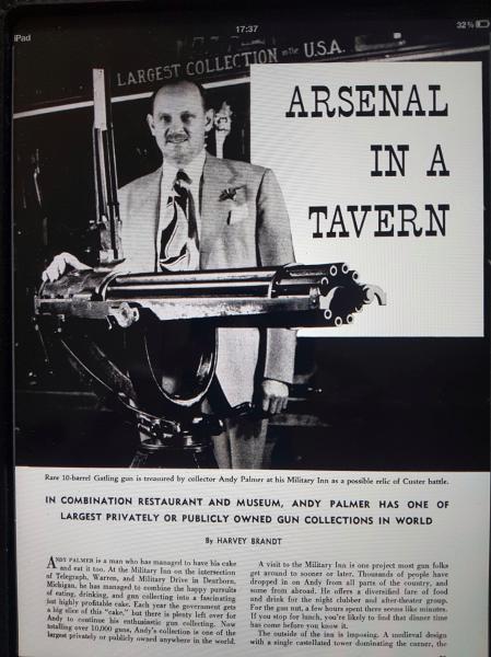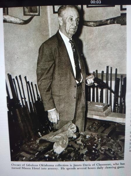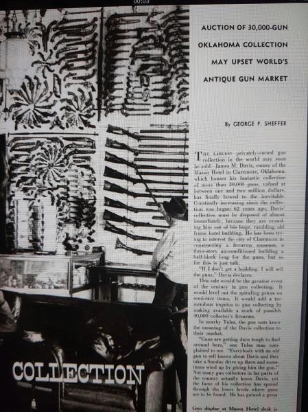 Publicado en la revista GUNS en 1956. Este caballero de Oklahoma comenzó a comprar armas en la década de 1890, comenzando con reliquias de la guerra de Secesión que se vendían por cuatro perras. Llegó a acumular más de ¡¡30.000!! armas, incluyendo nada menos que dos Colt Walker y 3 Patterson, uno de ellos en el raro calibre .28. Guardaba las armas en su hotel, llenando las paredes de la recepción y todas las zonas comunes de sus mejores piezas, para deleite de (parte de) sus huéspedes. También tuvo que clausurar varias habitaciones para guardar armas. Por la fecha en que el artículo se publicó, había propuesto a su ciudad ceder su colección para crear un museo,.y ante el nulo interés del Ayuntamiento, decidió comenzar a venderla.