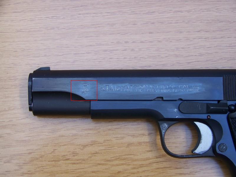 Perdón Pacopi, por inmiscuirme otra vez en tus cosas, pero es que a la lista de tu amigo le falta el emblema que lleva la pistola, el de la "cartera" se adoptó en 1931, pero no se cuando ni porqué, se cambió a este; pongo una foto como prueba.