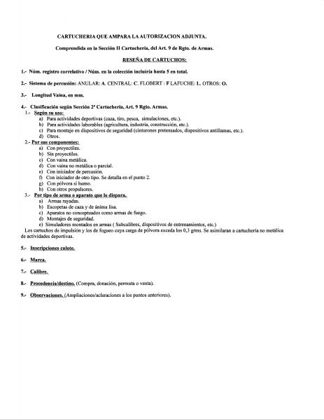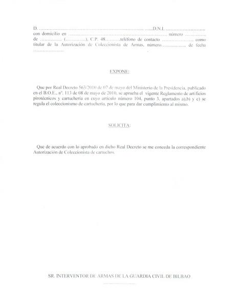 Presentado esto, esperamos de uno a tres meses, nos conceden el "LIBRO DE COLECCIONISTA DE ARMAS" y el mismo dia que pasamos por la IA para recojer el libro , presentamos la diligencia-solicitud para coleccionar municion. Es un solo documento que lo puedes redactar tu mismo (Adjunto ejemplo los datos del B.O.E son los antiguos es solo cambiarlos por los nuevos)