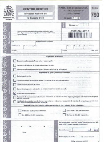 Unas pequeñas aclaraciones, para presentar la diligencia-solicitud de coleccionista de municion no se paga nada. Lo que ocurre es que para presentar la diligencia-solicitud es necesario poner el numero del "LIBRO DE COLECCIONISTA DE ARMAS".