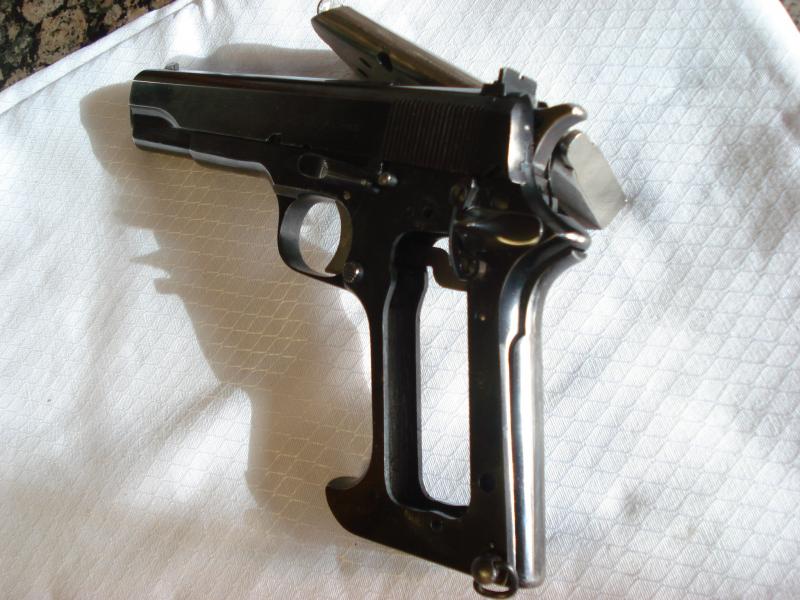 El pavonado es el típico de la época, por baño de sales, y no en frio como se hacia en los modelos 1920-21-22 y primeras variantes de A. El apoyo para la mano esta hecho probablemente añadiendo material mediante soldadura y mecanizando despues, ya que el armazón originalmente seria por supuesto recto en su empuñadura.