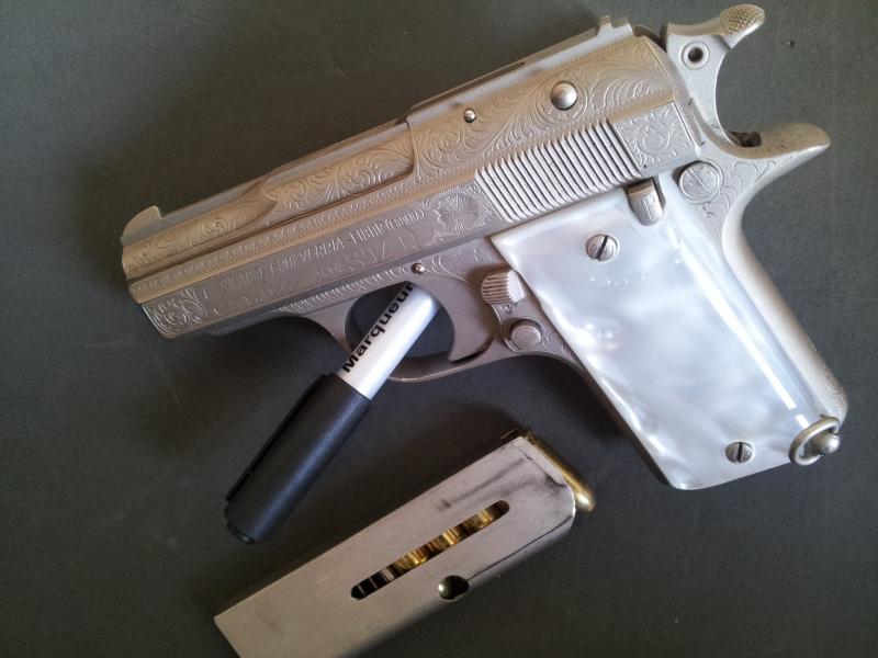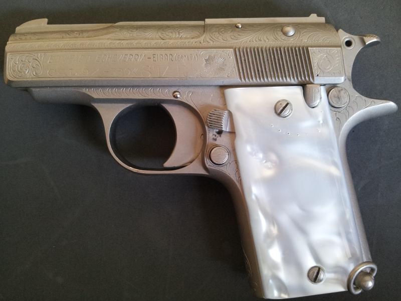 La pega es que ni las cachas de nacarina ni el acabado son los originales. Lo de las cachas es muy normal, porque debido al material empleado en la epoca y durante muchos años mas, ningun par ha llegado sano a nuestros dias, pues encogian hasta el punto de romperse.
