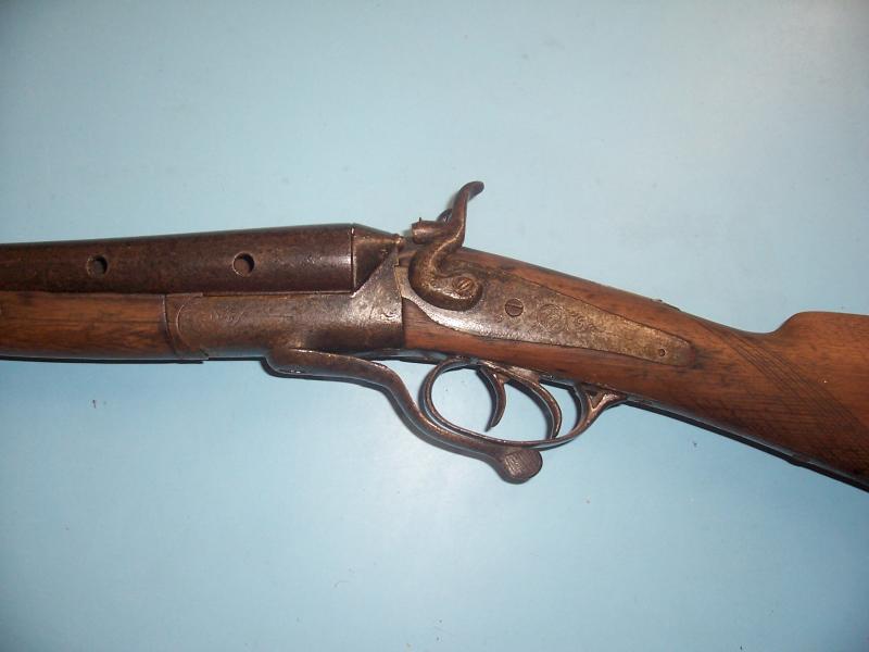 Lo que está claro es que se trata de una escopeta de cartuchos cal. 16 tipo lefoucheaux (de espiga) posiblemente de finales del siglo XVIII, tengo una inutilizada un poco mas moderna, mismo sistema de palanca de apertura, perrillos fuera, mismo calibre pero de fuego central.