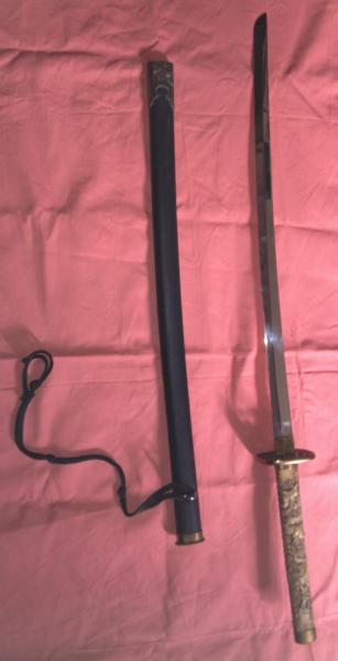 Primero la katana, parece acero inoxidable y de fabricación moderna, mas para decoración que otra cosa, corta lo mismo que un cuchillo de untar mantequilla: