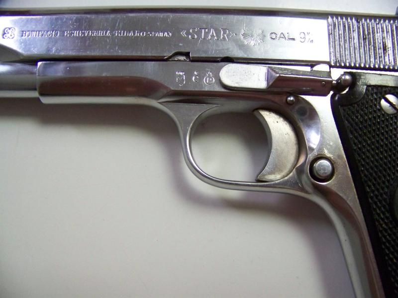 Por los punzones es del año1929 y trae su cargador que coincide con el arma 26xxx y en la corredera las siglas GC sin coronas, pero lo que trae de cabeza es que he buscado información y en las fotos que he visto solamente en el modelo de 1920 veo que la inscripción "BONIFACIO ECHEVERRIA EIBAR ESPAÑA STAR 9 m/m" esta en una sola linea y en otras pistolas viene esta leyenda en dos lineas. Colgare unas fotos de mi pistola y otra de un modelo en la que la inscripción es diferente. La verdad es que no consigo saber mas de este arma, y por lo que me contaron esta pistola apareció en la puerta de una intervención de armas en los años 60 y la guiaron diferentes Guardias Civiles hasta que llego a mis manos, he llegado a pensar si tal vez la corredera no sea la original del armazón, ya que el numero de serie solo viene en la base de la empuñadura. Si alguien me puede iluminar....