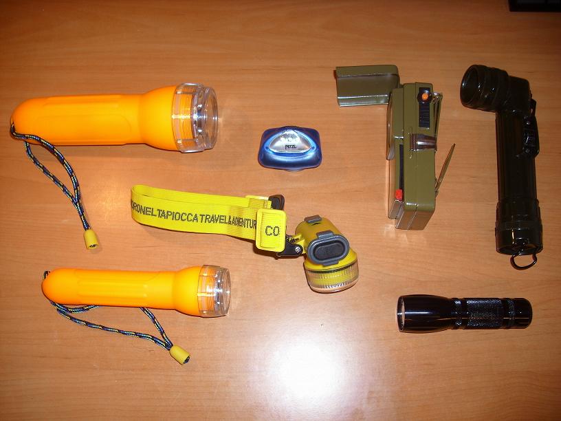 C - Linterna marca Coronel Tapioca. Construcción en plástico. Estanca, resistente al agua (buceo unos 5 metros). Con cinta elástica ajustable para portar en la parte frontal de la cabeza. Con varias posiciones de enfoque. Alimentación: 2 pilas LR6 1,5V.