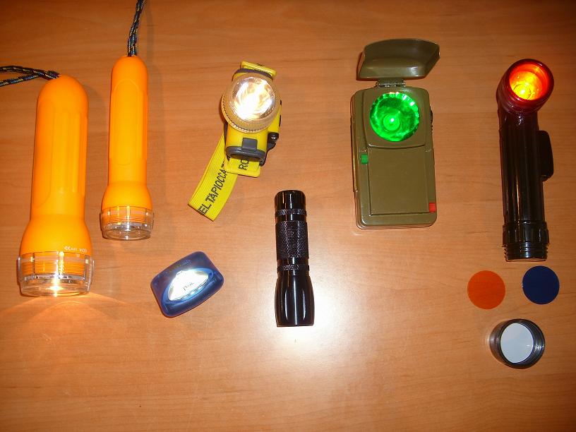 D - Linterna tipo militar. Construcción en metal. Con anclaje para cinturón y para botón. Con tapa protectora y filtros verde y rojo. Con pulsador para señales (morse). Alimentación: 1 pila 3R12 4,5V.