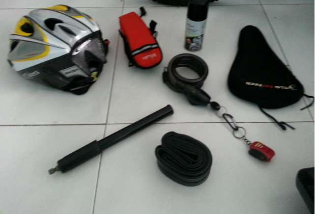 Accesorios: Portabidón de aluminio con los colores de la bici, bolsa portaobjetos para debajo del sillín, funda de silicona para sillín, cuentakm wireless(inalámbrico) con muchas funciones, linterna de led con soporte para el manillar, linterna led rojo para ser visto desde atrás, candado antirrobo, bufa, bote de grasa repelente y no mancha en spray, casco regulable al diámetro de la cabeza, una cámara por si pinchas cuando vengas a recogerla, caja de herramientas con lo básico y creo que eso es todo.