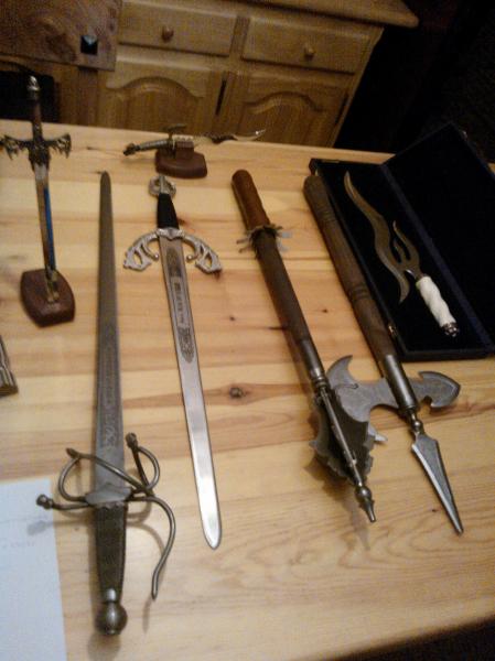 Se vende coleccion de cuchillos, miniaturas y navajas 1 machete de muela, 1 hacha deportiva de muela, 3 navajas, 10 miniaturas y 7 espadas colada, tizona y cuchilleria fantastica todo 100€
