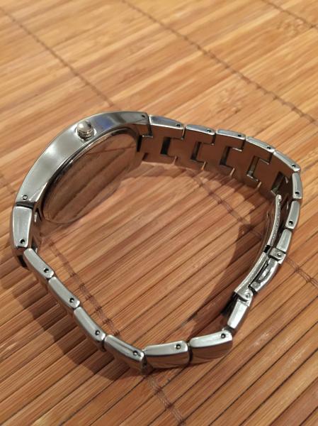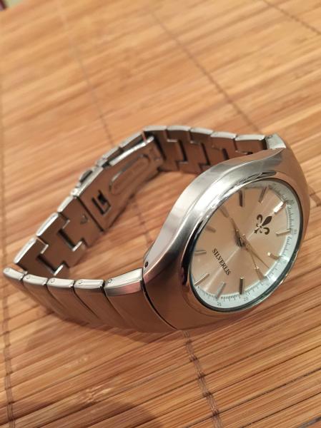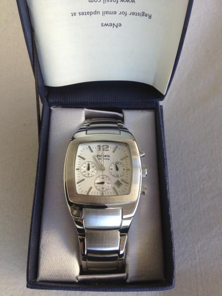 Junto al Fossil, REGALO otro reloj con movimiento de cuarzo, enteramente construido en acero inoxidable, NUEVO, sin uso, y todavía con el precinto plástico y sin pila: