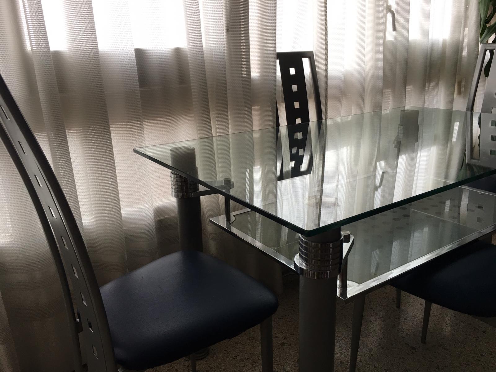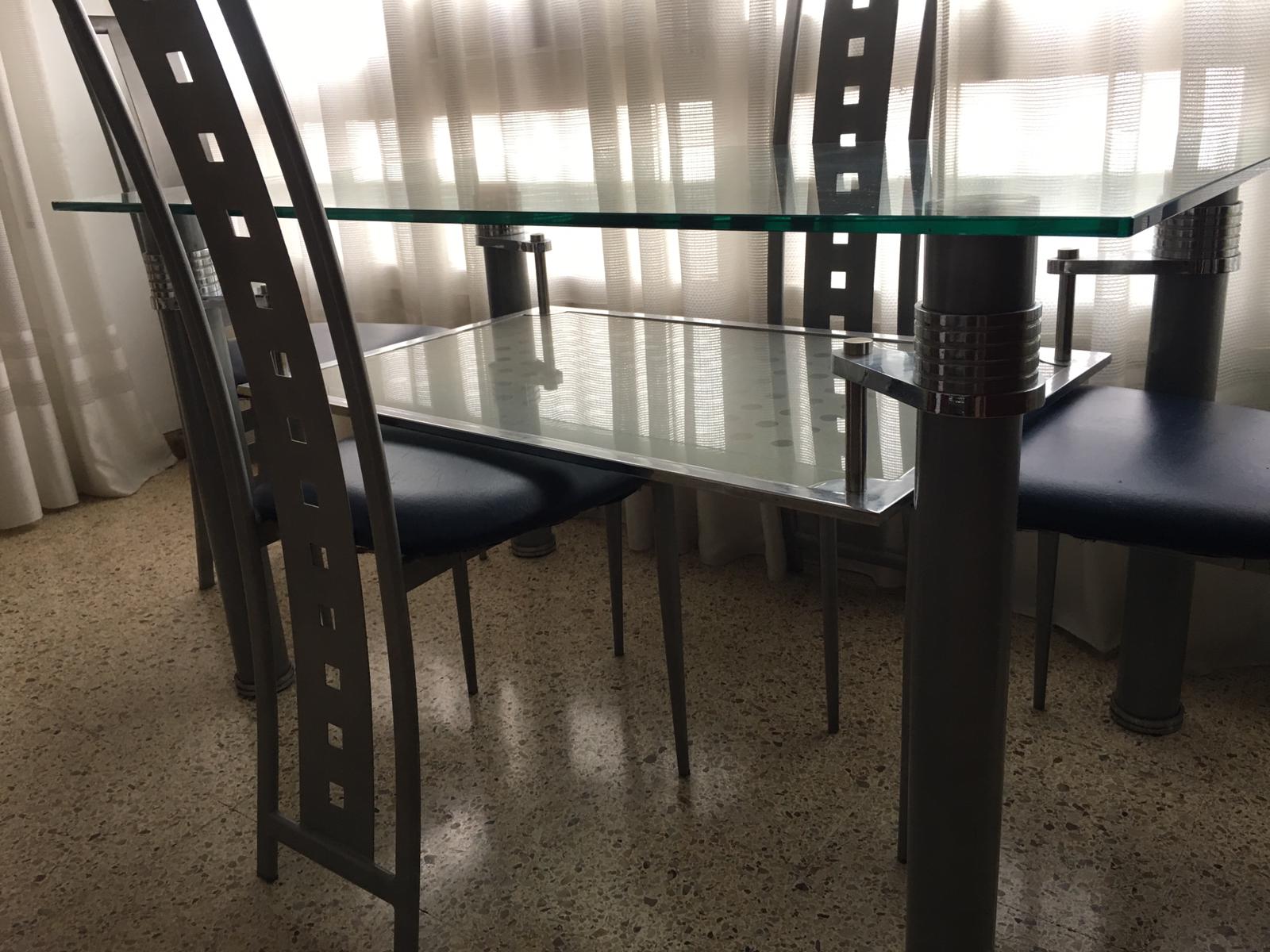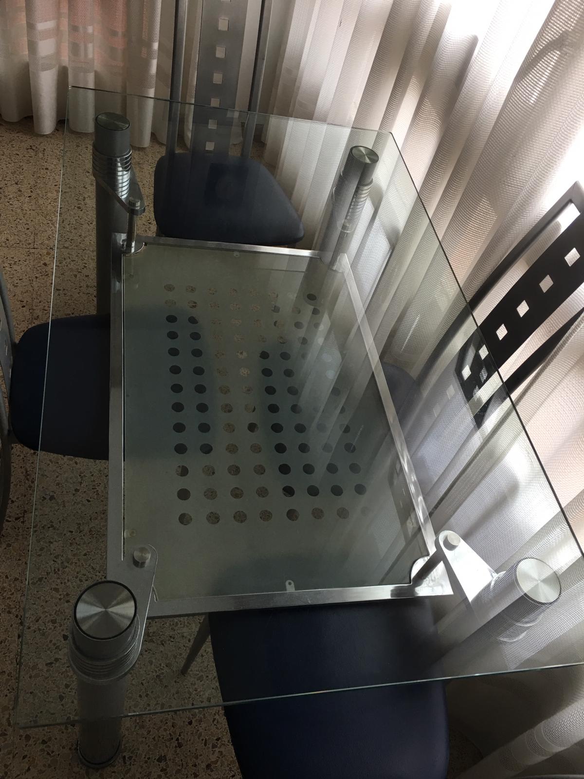 Mesa de cristal y su juego de cuatro sillas de diseño, prácticamente nuevas,por 250 euros,se encuentra en Barcelona capital.