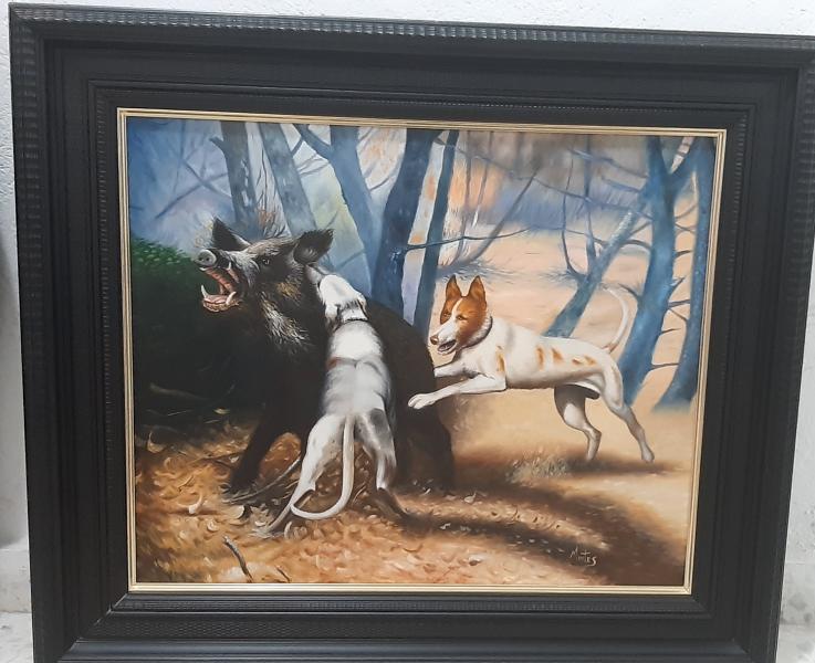 Cuadro al oleo pintado a mano escena de caza con marco en excelente estado. Pintura perfecta.