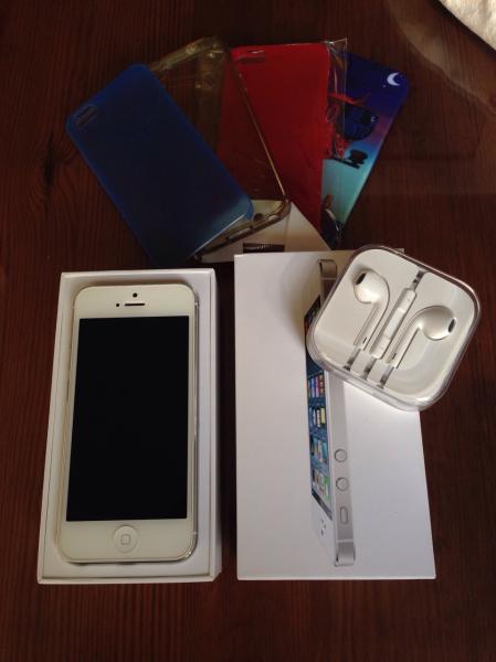 Vendo Iphone 5 blanco de 16gb, libre, prácticamente nuevo, funcionando perfectamente, usado siempre con funda y protector de pantalla. Incluidos cargador y auriculares originales todo en su caja original. Además incluyo protector de pantalla y 4 fundas.