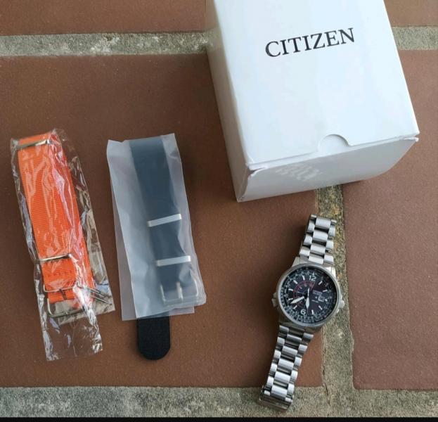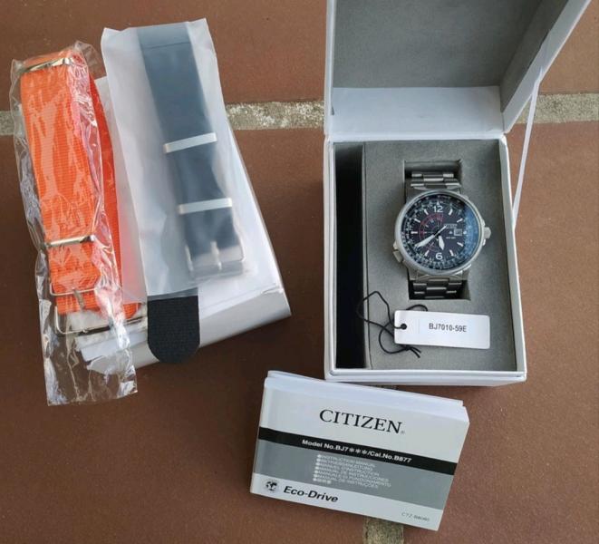 Citizen Promaster Eco-Drive, mod BJ7010-59E, en su embalaje original, con las dos cajas (blanda y rígida), manual de uso y eslabones sobrantes, energía eco-drive, se carga con el sol, solo tiene dos picotazos casi imperceptibles en la caja, entre las 11 y las 12, regalo dos correas nato sin estrenar, en color negro y naranja. Los reyes me trajeron un flamante Glycine y tengo que hacer sitio en la caja, soy cuidadoso con mis relojes. Quienes ya habéis hecho alguna operación en el foro conmigo sabéis que soy serio y responsable, tanto para comprar como para vender.