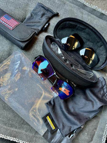 Gafas de sol Oakley Flak jacket jet Black ( 3 juegos de lentes intercambiables) Black iridium / Prizm Trail rosado y otros Clear transparentes.Estuche original rígido tela tipo Kevlar para llevar todo el conjunto + fundas y repuestos de patillas, otros anagramas laterales y soportes nasales y un kit de limpieza y mantenimiento de la marca.
