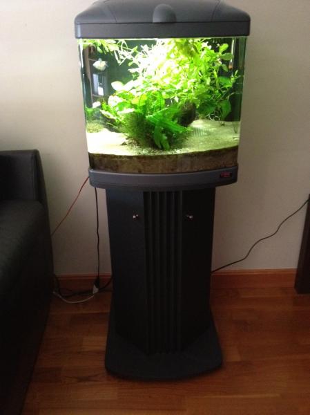 Vendo un acuario de agua dulce, 60 litros, sin un rasguño, como nuevo. Acuario de alta gama, filtración muy potente, gran capacidad de cargas de filtro y va con su mueble a medida, con puertas para guardar todos los aparejos. La bomba es absolutamente silenciosa, no se oye nada de nada. Entrego cargas del filtro (esponja y cargas cerámicas), calentador 50W, manguera-sifón para cambios de agua, plantas acuáticas de muchos tipos, iluminación con tubo recién cambiado, temporizador para la luz, tronco decorativo y algunos peces. Además del tubo, tiene añadidos dos casquillos para aumentar la iluminación con bombillas de bajo consumo. No tengo las bombillas puestas ahora porque no tengo plantas de altos requerimientos lumínicos, pero por si se quiere, la instalación está hecha.