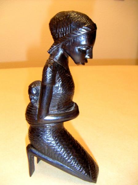 (VENDIDA) Estatuilla Chuabo, Representa la Matriarca, la mujer está en posición de oración, con su hijo sujeto a su espalda por su capulána (lienzo tradicional de uso femenino)