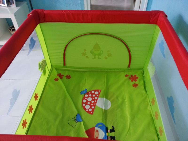 Parque infantil más grande que el típico. Medidas 105105x77cm ancho x largo x alto. La altura interior es 60cm. Tiene puerta con cremallera y suelo acorchado. Se monta y desmonta como una cuna de viaje y una vez cerrado no ocupa espacio, 85x20. Esta impecable, ni una sola mancha ni marca. Costó 70€ y lo vendo en 40€.