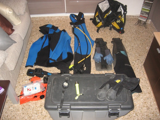 Vendo equipo completo de buceo talla XL , compuesto por regulador recientemente comprobado 45 euros valio la comprobacion. JAquet , neopreono talla 7 , botella de 15 litros sin revisar, guantes talla XL-XXL, brujula, linterna , aletas XL , cinturon con pesos de 2kg en total 10 kg, escarpines, boya para señalizar y cofre para guardar todo