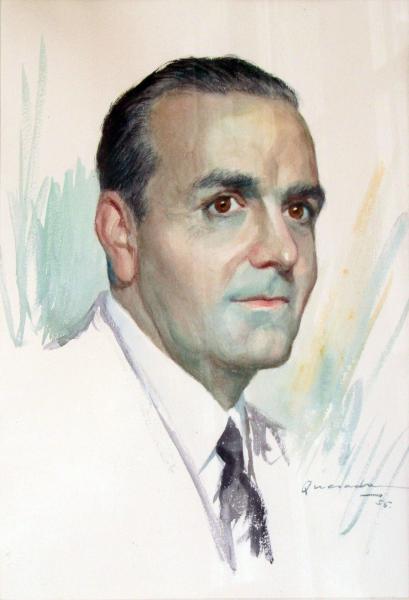 Vendo acuarela de Julio Quesada Guilabert. Acuarela sobre papel firmada y fechada en 1956 en el ángulo inferior derecho. Medidas sin marco 38x28 cm. Posiblemente es un retrato de un medico, regalo del laboratorio farmaceutico Schenley, aun conserva la etiqueta en la parte trasera del marco. Precio 400€