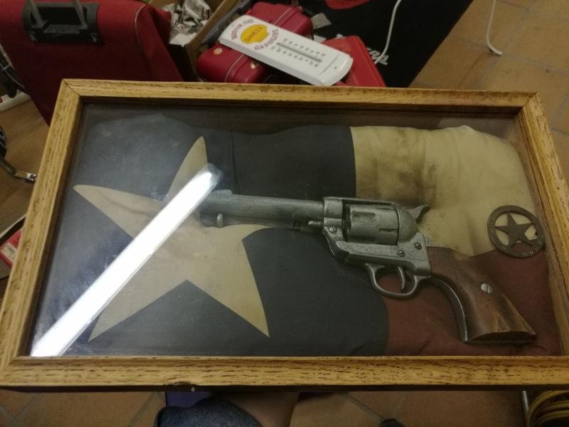 Viene en una vitrina con una bandera de usa y una estrella de Sheriff de texas,supongo que la persona que la tenia quiso hacer una pequeña exposicion.