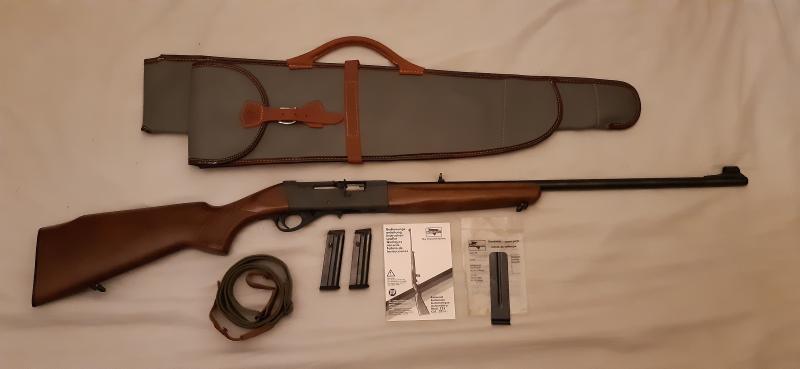 La entrego con 2 cargadores de 10 cartuchos (no vendo por separado), correa de nailon y cuero, una funda en perfecto estado, útil para colocar el muelle del cerrojo cuando se desmonte para limpiar, baqueta de limpieza y manual de instrucciones.