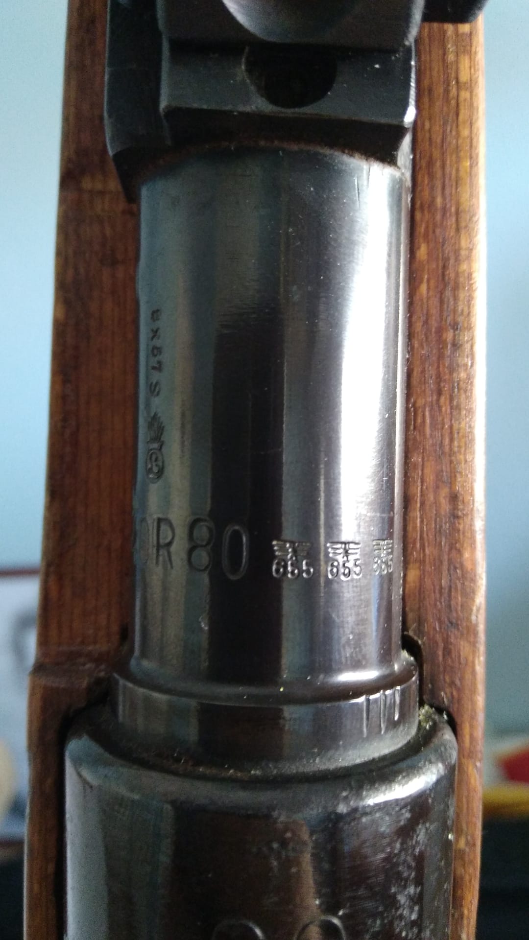 El estado de conservación de la acción y cerrojo no se corresponden con el del cañón, que claramente tiene un pavonado más cuidado y ausencia de manchas, lo que muestra que es más moderno. Hay que añadir el código de reemplazo del cañón que, aunque no se ve completo, parece ser 40R80, lo que se correspondería con un cañón de reemplazo fabricado el año 1940, que sí se correspondería con una fabricación de cañones de repuesto de Sauer Sonh Suhl, dado su código WaA655; Abundando en ello, esas marcas, (3 rayas), que hay en el cañón junto al puente delantero, se corresponden con las marcas de control que cualquier armero civil haría para desmontar y volver a montar un cañón, para dejar el headspace igual que como estaba antes.