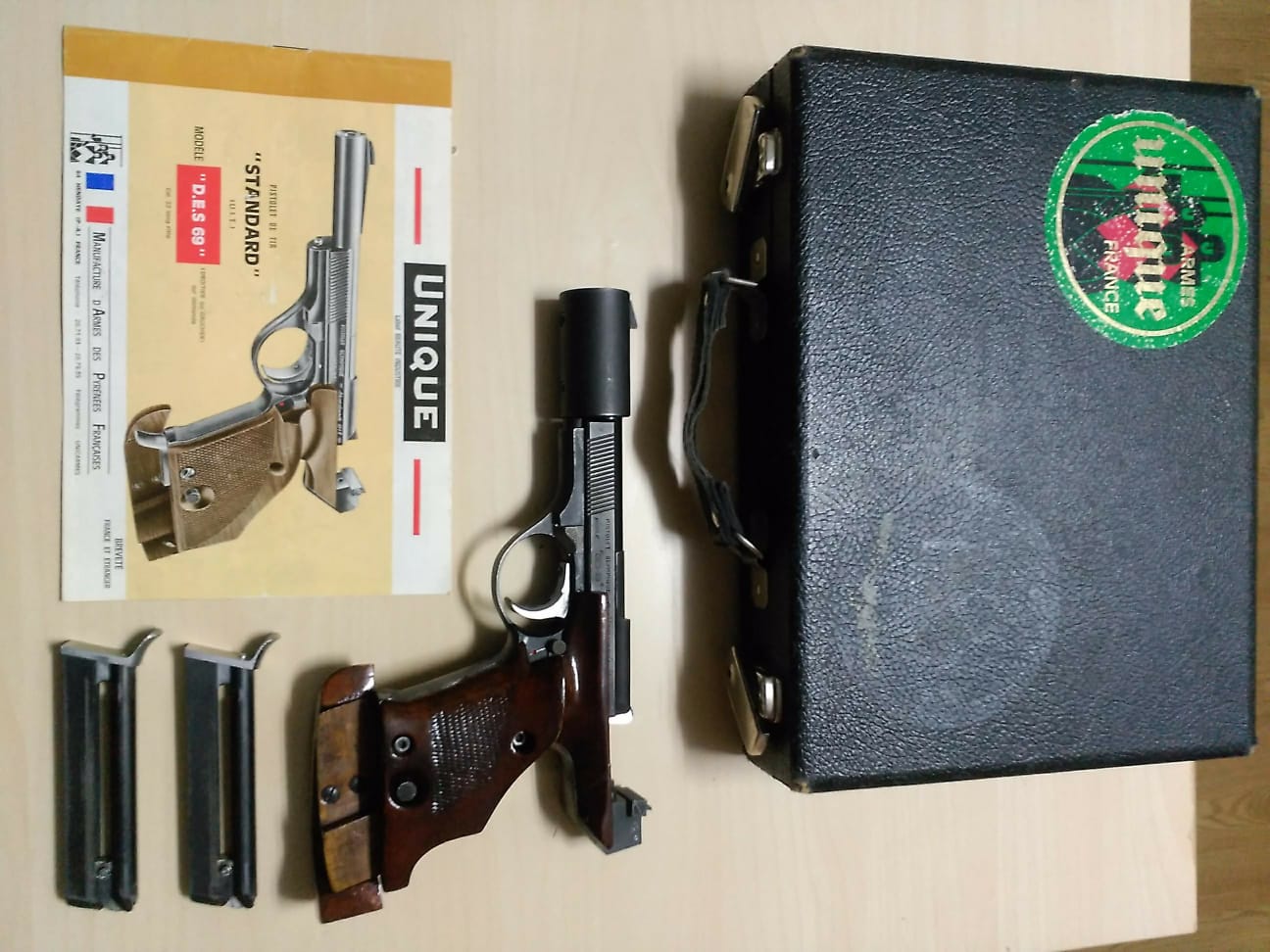 Pistola Unique Des 69, calibre 22, en su maletín original, los 2 cargadores, manual y accesorios como se ve en las fotos, una de las mejores pistolas para subir de categoria y competir. Cañón de 12 estrías, tornillo para la práctica del tiro en seco, reglajes del disparador, contrapeso original, etc.