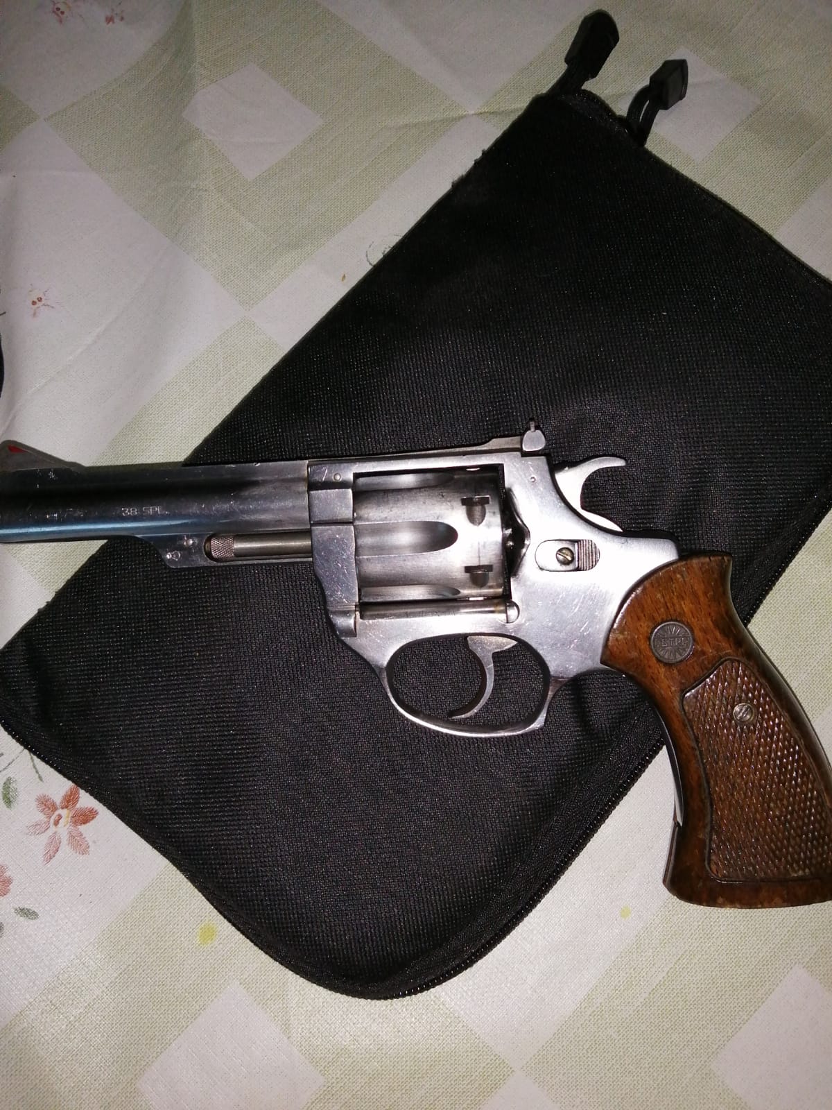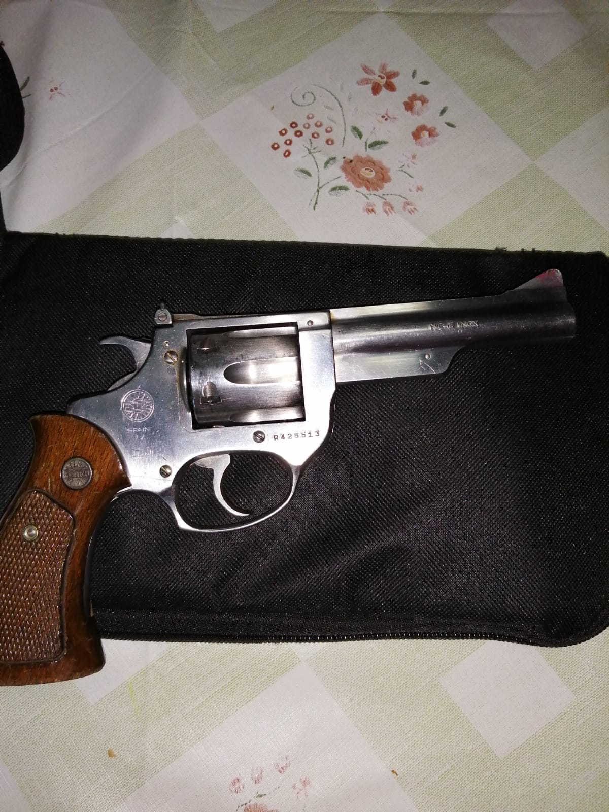 tres armas porque quiere comprar otras y necesita el espacio en el armero, una es un revólver Astra del calibre 38 de 4 pulgadas en inoxidable, un revolver muy bonito, pide 90€ mas gastos de envio que vienen a ser uno 35€ mas o menos.