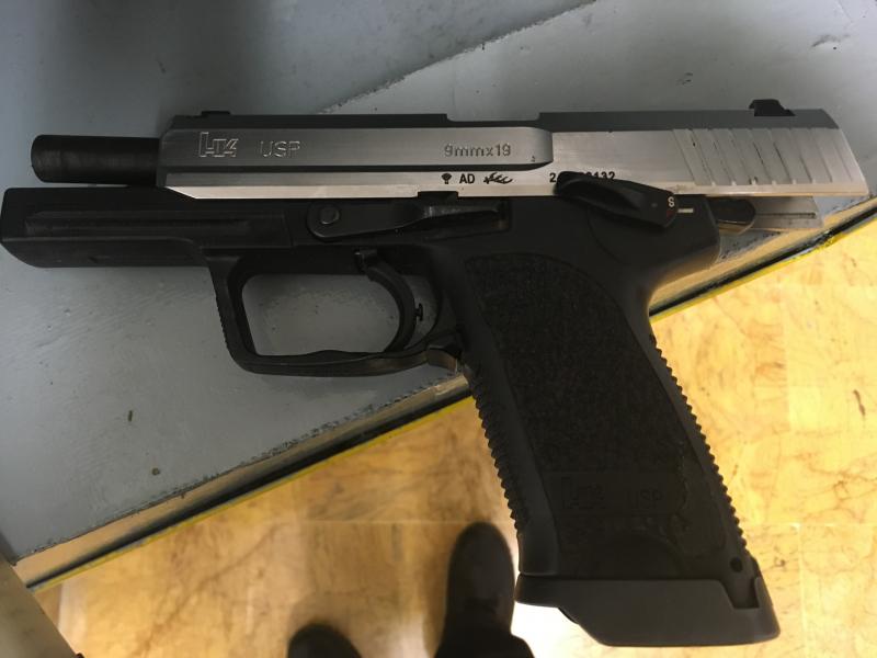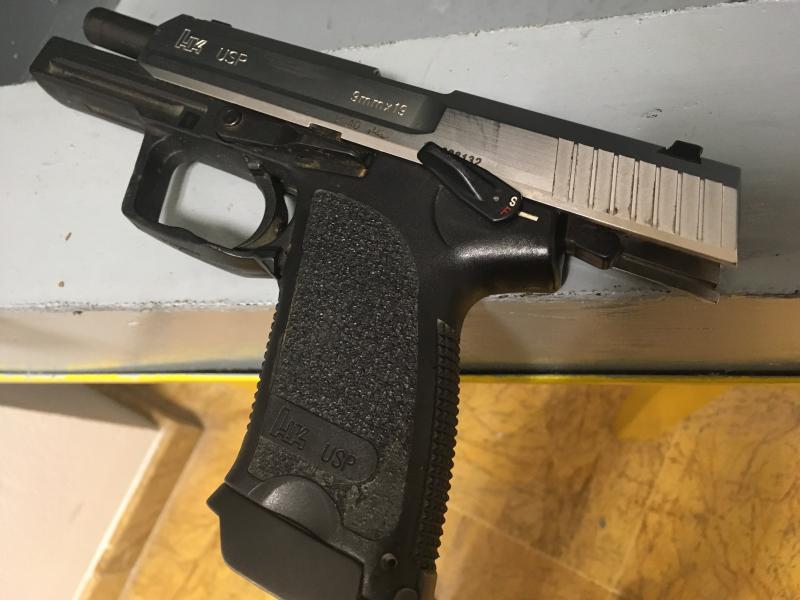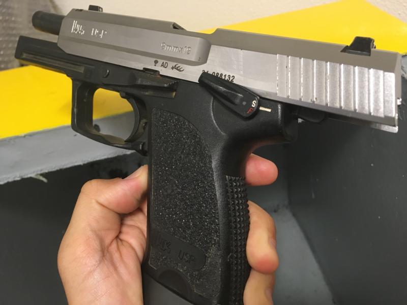 Pistola HK Standard con corredera plateada. Tiene colocado un fannel en la empuñadura para poder utilizar cargadores de 18 cartuchos.