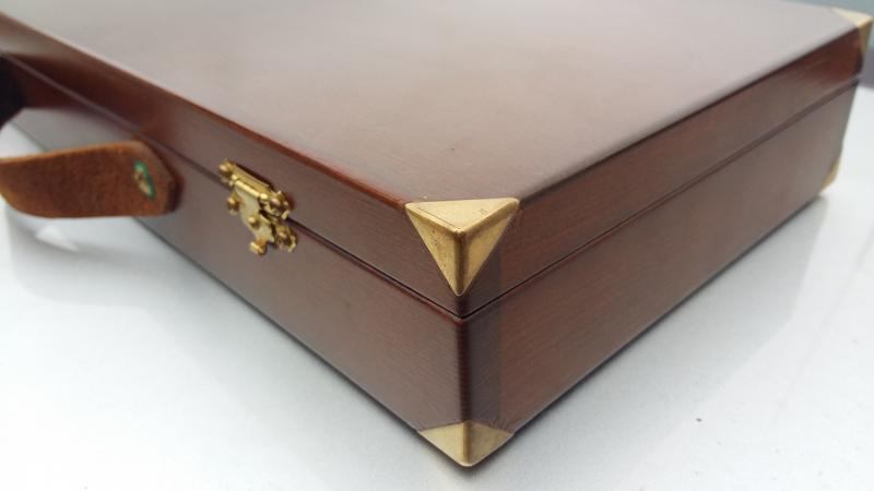 La caja, es única y fabricada por maestro ebanista, esta realizada con madera de pino de Oregón, forrada con tapiz de billar y cordón dorado con placa dorada y proyectil inerte del 45Lc. Las piezas de esquinero, no son de chapa, son macizas, cortadas de bloque de metal, pulidas e insertadas con precisión en la madera con un ajuste impecable. Es una obra de arte.