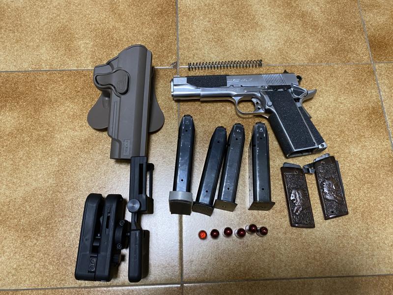 4 cargadores, 2 muelles de diferente dureza, 2 fundas y 6 salvapercutores. Tiene pocos disparos, con munición Geco funciona perfectamente que es la que he utilizado, magtech y fiocchi a veces da alguna interrupción al introducir el cartucho en recámara. El martillo se queda a medio recorrido cuando la corredera se queda sujeta por la retenida y la liberas al accionar la retenida. Las cachas de madera las quite porque no dan mucho grip y por eso tiene la lija.