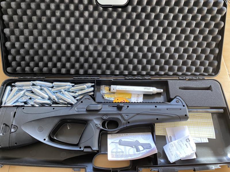 Está impoluta e incluye la funda rígida de la foto, todas las botellas de CO2 de la foto, y el adaptador en el que se pueden meter dos botellas de CO2 simultáneamente. Sólo el adaptador vale más de 60 euros.