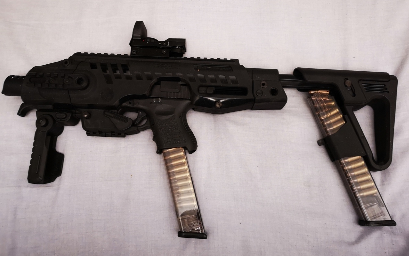 Tiene guardamanos delantero plegable y extraíble, raíles Picatinny en ambos lados y zona superior para colocar visores, linternas o punteros, culatín extensible con soporte para cargador extra y diseño compacto.
