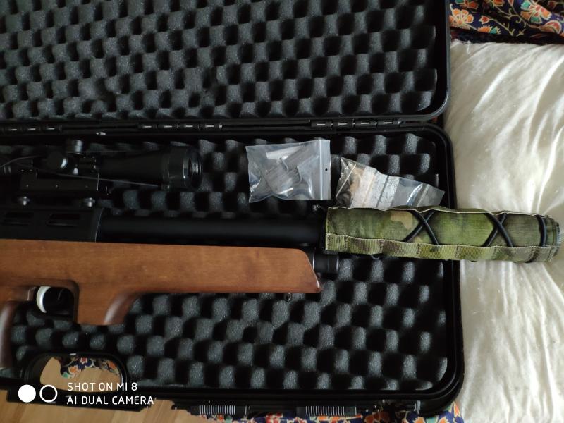 Adaptador y supresor(con un pequeño golpe,lo recibí así,no afecta a su funcionamiento)y funda acolchada de camuflaje para disminuir el ruido
