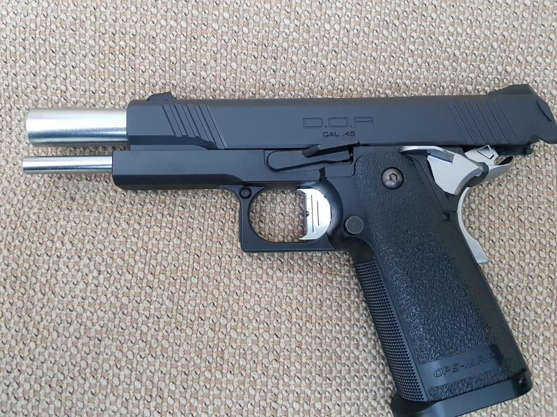 Hola, la compre para hacer punteria dentro de casa pero hace mucho ruido. esta nueva la bolsa esta casi llena, solo habre utilizado dos cargas de gas. · Fabricante: Tokyo Marui · Calibre: 6 mm · Peso: 839 g · Hop-Up: Ajustable · Capacidad cargador: 31 BBs · Longitud cañón interno: 112 mm · Modelo: Hi-CAPA D.O.R. · Modo disparo: Semi-automático · Gas recomendado: ABBEY Predator Gun Gas 144a