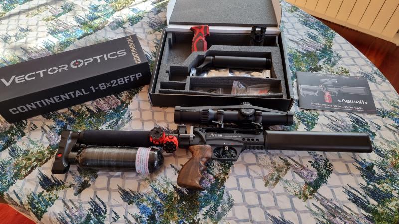 Edgun Leshiy 2 cal .25 cañon 350 mm, plenum largo, botella carbono 350 cc, grip en madera de nogal y moderador interno de 6 baffles. Comprada en Noviembre 2020