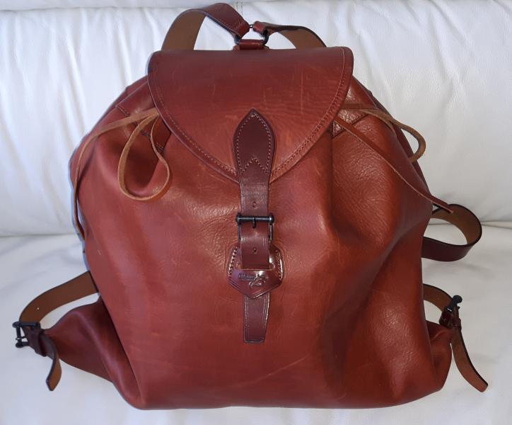 Piel natural curtida al vegetal. Hecho a mano por guarnicionero hace un año. Me costó 185 euros. Apenas usado. Esta pensado para caza pero yo lo usé solo por ciudad. Tamaño grande, 45cm de alto por 48cm de ancho. Bolsillo interior. Se cierra con cordón de piel además de tapa viveada en piel.