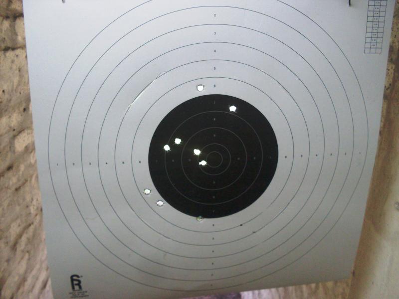 Si el blanco que has puesto es a 10 metros, y seguramente con dos manos, algo falla,( tendrias que meter todos los tiros mas o menos en un circulo de 10-15 cm.) por que veo ademas que van todos los tiros hacia la izquierda.