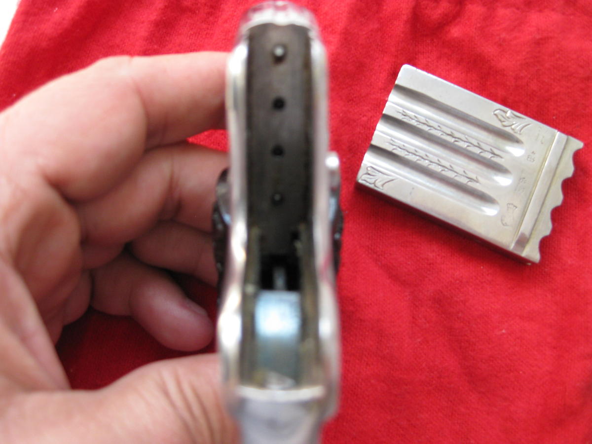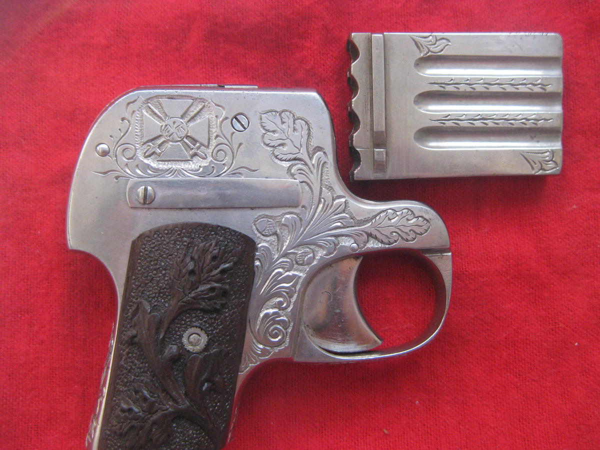 Espero que con estos datos le resulte más fácil la búsqueda de su arma, aunque te advierto que será difícil, puesto que los fabricantes querían guardar su anonimato por los motivos antes expuestos, en cambio si la puede encontrar en catálogos de la época (los vendedores no tenían tantos escrúpulos.