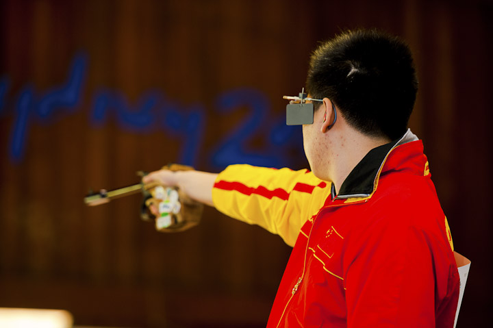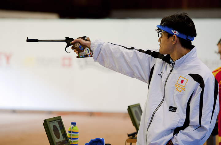 con una puntuación de 555 puntos. El ganador ha sido el tirador japonés campeón mundial de la modalidad Tomoyuki Matsuda con 567 + 97 = 664.0 puntos. Segundo ha sido el italiano Francesco Bruno con 563 + 96.8 = 659.8 puntos y tercero el tirador chino campeón olímpico de pistola de aire Wei Pang con 561 + 95.9 = 656.9 puntos. Los 8 tiradores que han accedido a la final utilizan el mismo modelo de pistola: Morini CM84E.Salu2.