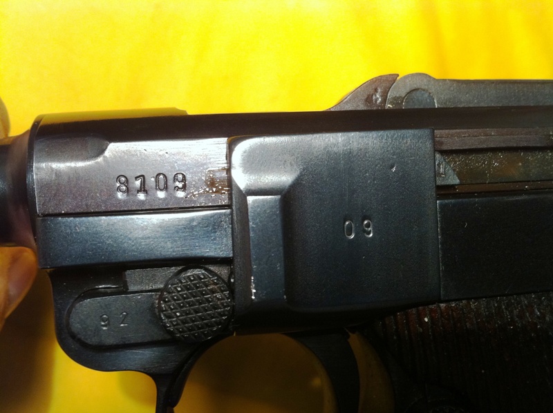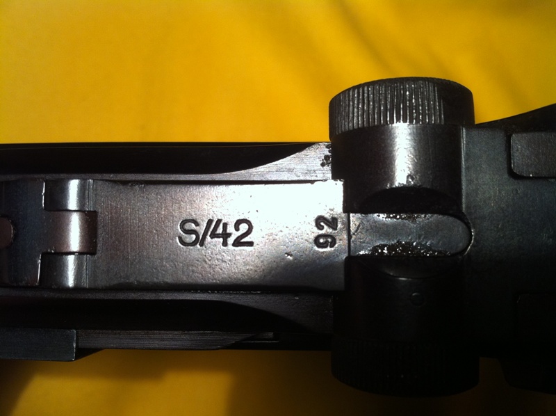 Pues a la vista de las fotos que estan definidas, lo que tienes es un refrito de tres pistolas, del que el armazón de la corredera pertenece a una P08 fabricada en 1936 y la rodilla fabricada por Mauser (S/42), pero de otra pistola.