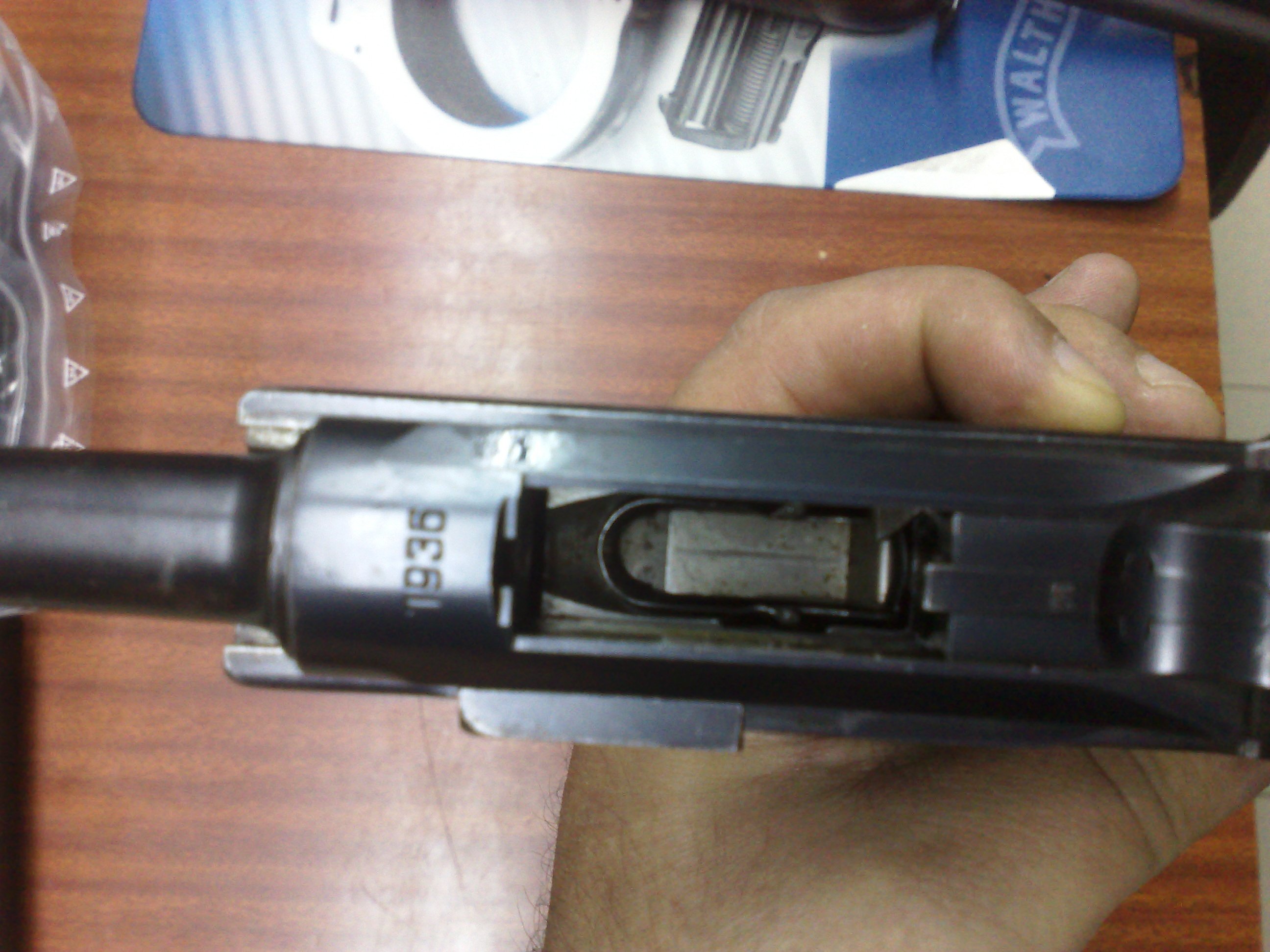 La cuestión es que me gustaría saber algo más de esta pequeña maravilla. Perteneció al padre de mi amigo, Oficial del Ejercito de Tierra español, el cual la tuvo muchísimos años, hasta que se la transfirió a su hijo, a la sazón mi amigo. Parece ser que es la versión que utilizó la Luftwaffe, por el cañón más corto que las que usó la Marina Imperial del Tercer Reich. La información que me han facilitado es que las numeraciones de las piezas coinciden, por lo que se trata de una pistola original "entera", no de las que se construyeron en los años 40 en España "canibalizando" varias pistolas, con lo que las numeraciones diferían. Parece ser que todas las piezas son originales, a excepción de un pasador que se rompió y que fue sustituido por uno fabricado al efecto por un armero militar en los años 70.